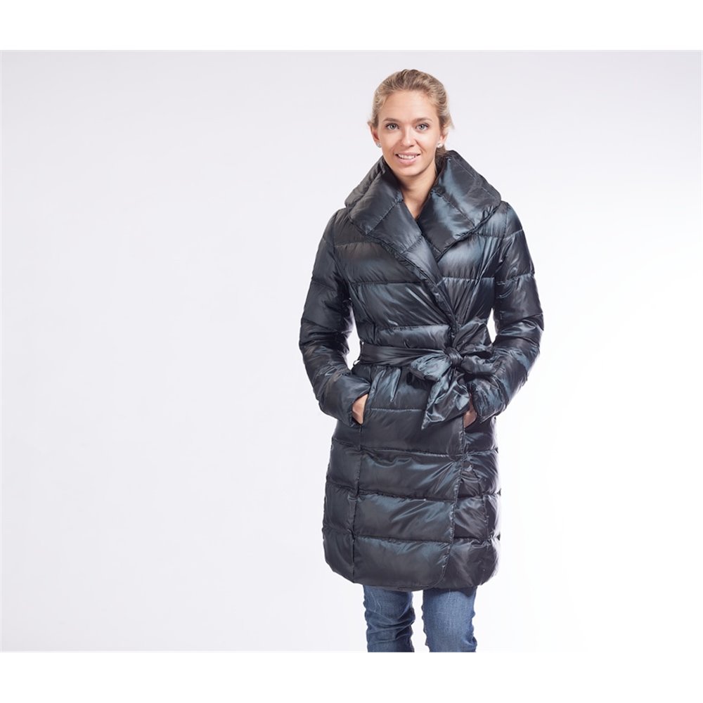 Пальто на пуху с асиметричной застежкой на кнопки. Карманы прорезные на молнии. Объемный воротник эффектно лежит на плечах. А в поднятом состоянии убережет Вас от ветра. Длина по спинке 94+-2см