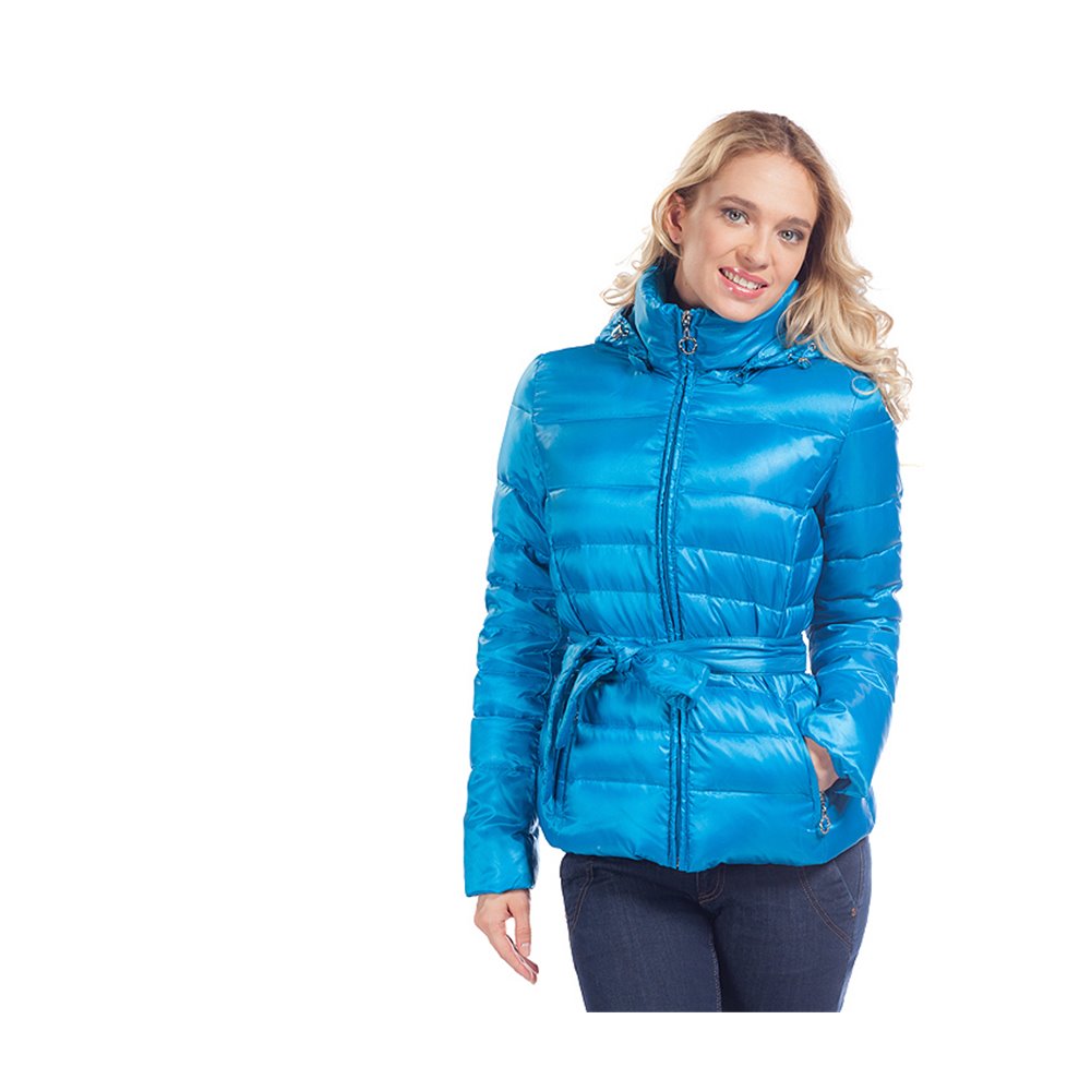 Куртка на пуху, застежка молния, карманы прорезные на молнии. Чуть приталенный силуэт. Капюшон отстегивается. Длина по спинке 62+-2см.