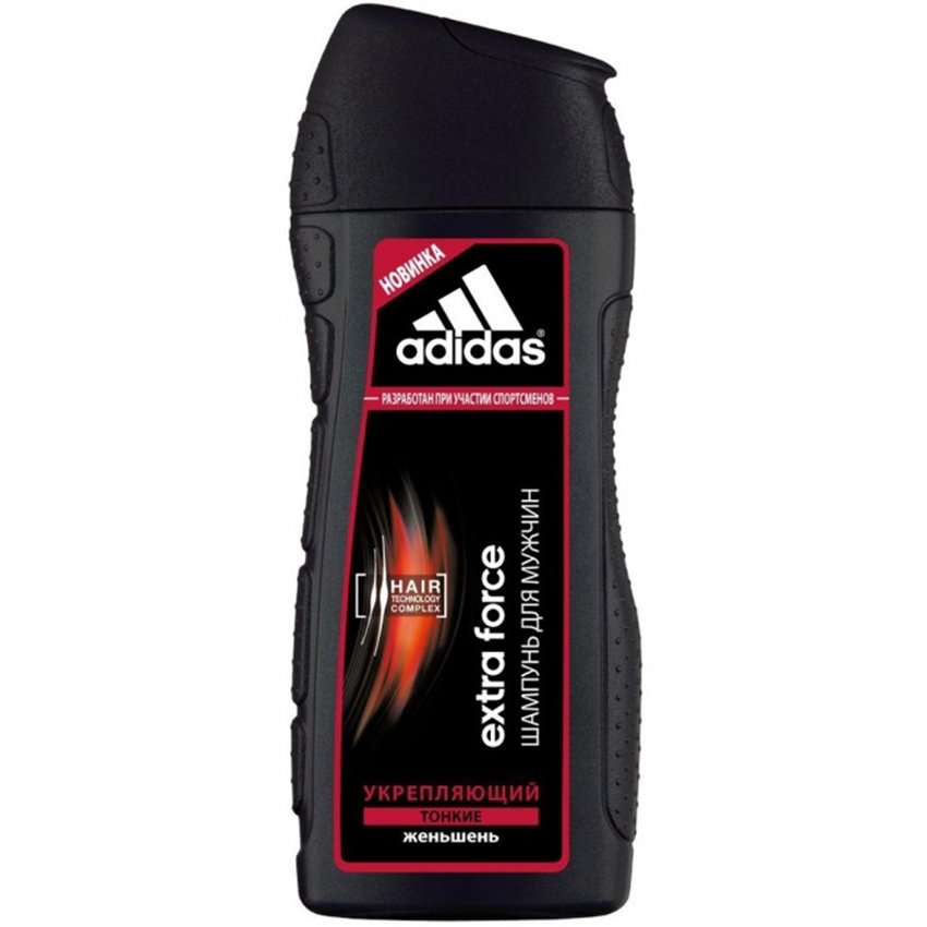 Экстремальный климат, занятия спортом и, как следствие, частое мытье головы способствует ослаблению волос. Мужчинам нужен шампунь, который не повреждает волосы даже при частом использовании. Шампунь Adidas "Extra Force" разработан при участии спортсменов. Его инновационная формула c комплексом Hair Technology обеспечивает глубокое очищение тонких волос. Комплекс Hair Technology - это уникальное сочетание двух основных компонентов, известных своим действием: