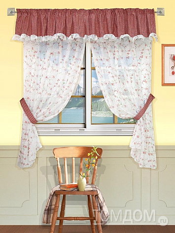 Ламбрекен 1 шт.: плотная основа бело-красно-бордового цвета оформлена рюшей в тон портьер. Ширина -- 285 см., высота -- 42 см., крепление -- шторная лента (крючки).Вуаль 2 шт. и 2 подхвата. Легкая, белая основа вуали оформлена цветочным рисунком. Размеры одного полотна: ширина: 140 см., высота: 185 см. Крепление: шторная лента (крючки). 2500 р. 2410 р.
