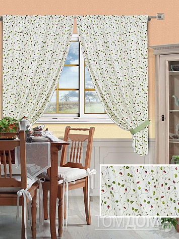 Портьеры 2 шт. и 2 подхвата. Плотная основа портьер белого цвета оформлена ягодным рисунком в виде земляники. Размеры одного полотна: ширина: 140 см., высота: 165 см. Крепление: шторная лента (крючки). 3110 р. 2990 р.