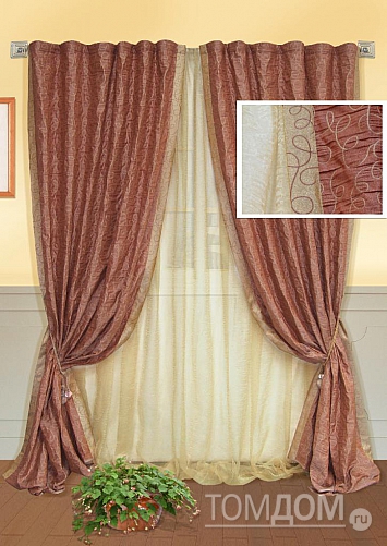 Тюль (вуаль) 1 шт.: ширина -- 365 см, высота -- 273 см., крепление -- шторная лента (крючки). Портьера 2 шт. Плотная, блестящая основа портьер розово-терракотового цвета оформлена фантазийным рисунком, дополнена отделкой из изнаночной стороны основного полотна. Размеры одного полотна: ширина: 150 см., высота: 273 см. Крепление: шторная лента (крючки). 10530 р. 10140 р.