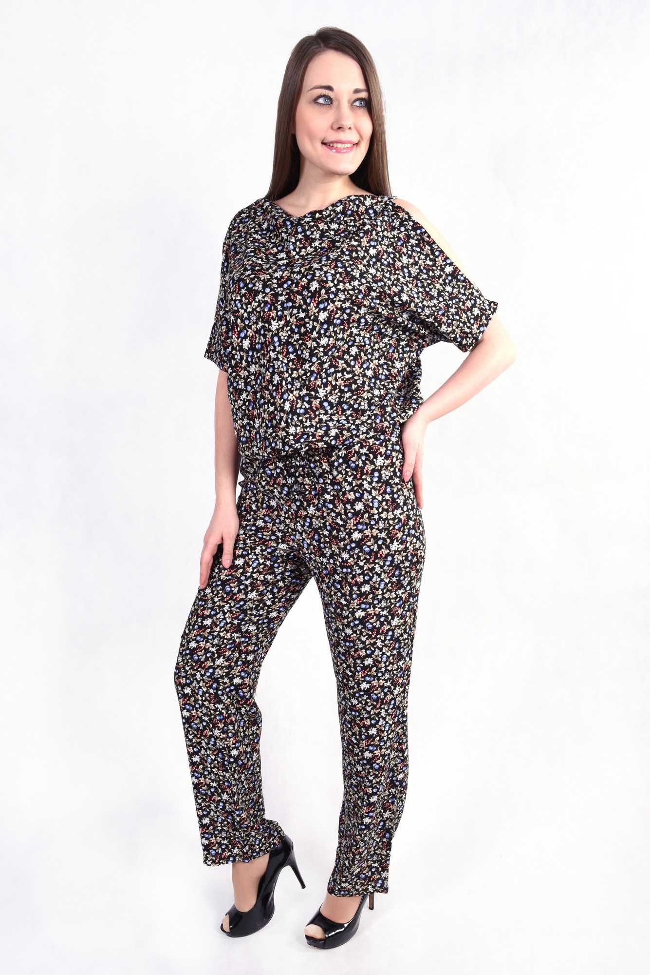Легкий, летний комбинезон выполнен из качественного турецкого хлопка с добавлением вискозы. В области груди не большая драпировка. В области плеч симметричные разрезы. На талии расположена эластичная вставка-резинка и завязки. На левом плече застежка.